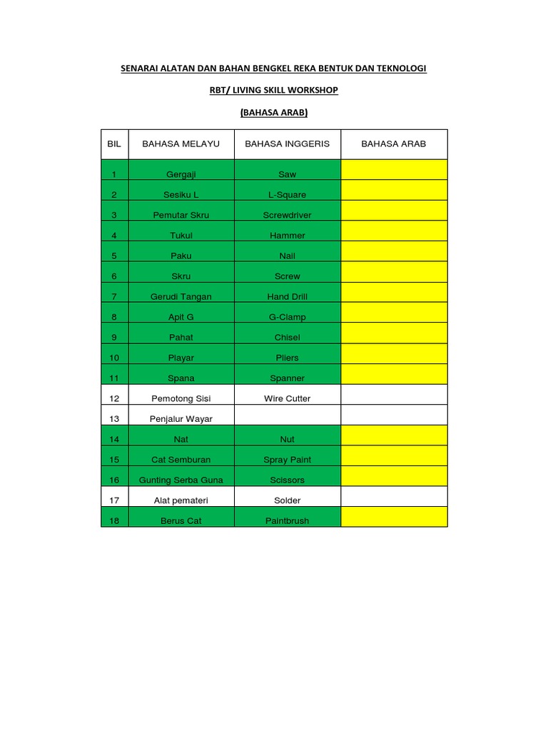 Senarai Alatan Dan Bahan Bengkel Reka Bentuk Dan Teknologi Pdf