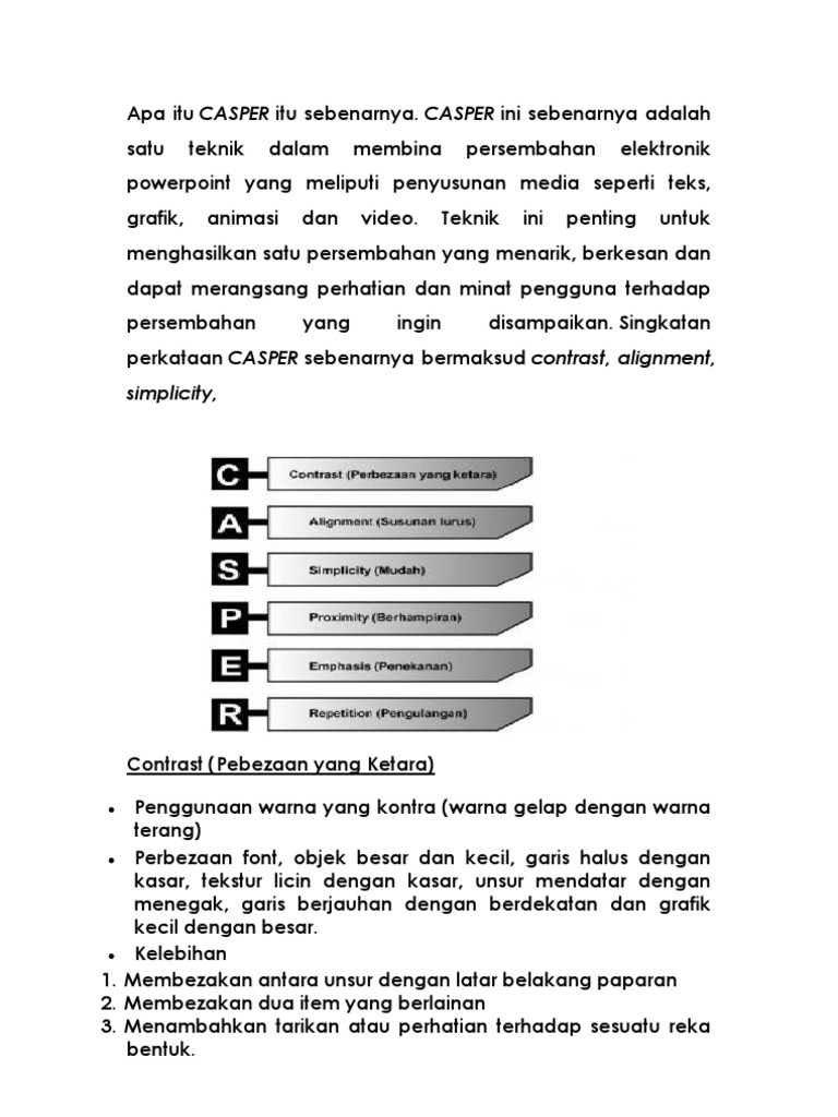 Prinsip-prinsip CASPER ialah. Documents Similar To Penghasilan Bahan Visual Untuk Pengajaran Dan Pembelajaran. CASPER CASPER adalah singkatan untuk prinsip- prinsip reka letak visual.