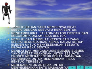 FAKTOR PEMILIHAN REKA BENTUK. Rupa bentuk Rupa bentuk sesuai dan menarik. Sukses SPM 2021 membincangkan teknik-teknik yang boleh diguna pakai dalam menjawab soalan Reka Cipta - Faktor Pemilihan Reka BentukGuru.