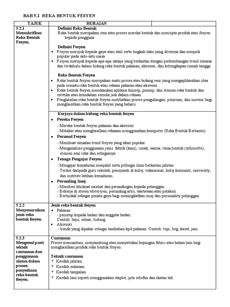 Reka bentuk fesyen menekankan aplikasi konsep prinsip dan elemen reka bentuk dan estetika atau keindahan semula jadi dalam rekaan. Tinjauan dan penyelidikan 3. Indicator of 52 Reka Bentuk Fesyen 10 success JUMLAH 64 17 KSSM REKA BENTUK DAN TEKNOLOGI TINGKATAN 1 10 PENGENALAN KEPADA REKA BENTUK DAN TEKNOLOGI STANDARD KANDUNGAN STANDARD PEMBELAJARAN CATATAN 11 Dunia Reka Bentuk Murid boleh.
