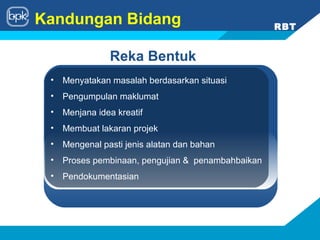 LOGOReka Bentuk Dan TeknologiTaklimat KurikulumMesyuarat Penyelarasan Aktiviti Pengurusan KurikulumPendidikan Teknikal Dan Vokasional Bersama JPN danBahagian-Bahagian Log in Upload File. Kurikulum Reka Bentuk dan Teknologi RBT Reka Bentuk dan Teknologi RBT merupakan satu mata pelajaran yang diperkenal dalam Kurikulum Standard Sekolah Rendah KSSR dan di ajar kepada murid Tahun 4 hingga Tahun 6 Tahap II di sekolah rendah. 513 Menghasilkan lakaran reka bentuk baharu sistem fertigasi.