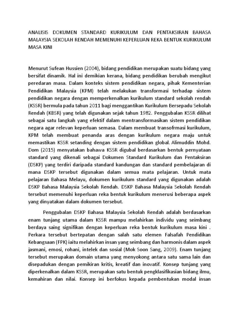 Analisis Dokumen Standard Kurikulum Dan Pentaksiran Bahasa Malaysia Sekolah Rendah Memenuhi Keperluan Reka Bentuk Kurikulum Masa Kini Pdf