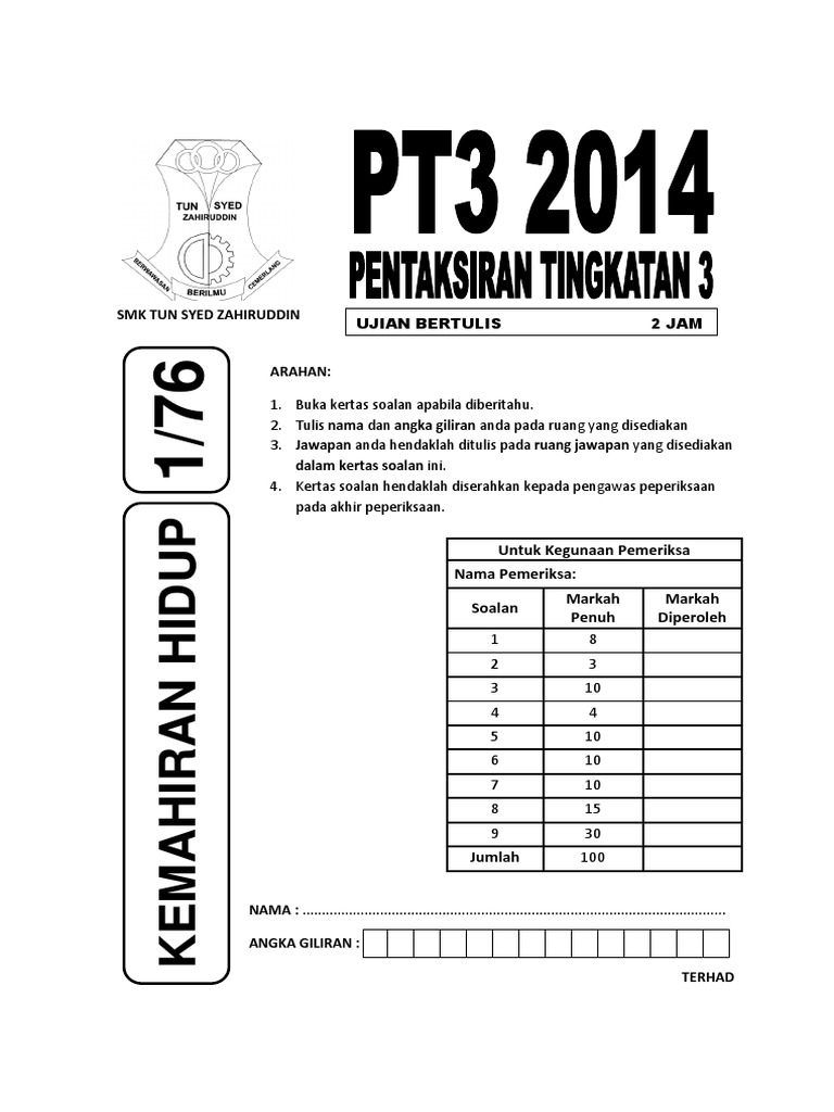 Anda dikehendaki menjawab semua soalan percubaan. Mulai tahun 2020 sekolah-sekolah menengah di seluruh negara diberi kuasa sepenuhnya untuk mengendalikan dan menyediakan soalan Pentaksiran Tingkatan 3 PT3. MUKA DEPAN KERTAS SOALAN.